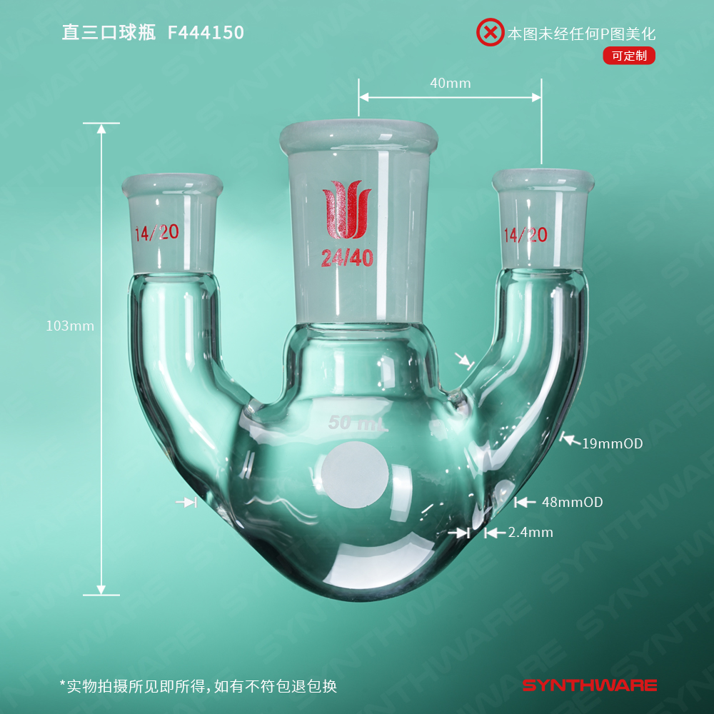 直三口球瓶,厚壁高强度,中间磨口:24/40,侧磨口:14/20,50ml F444150