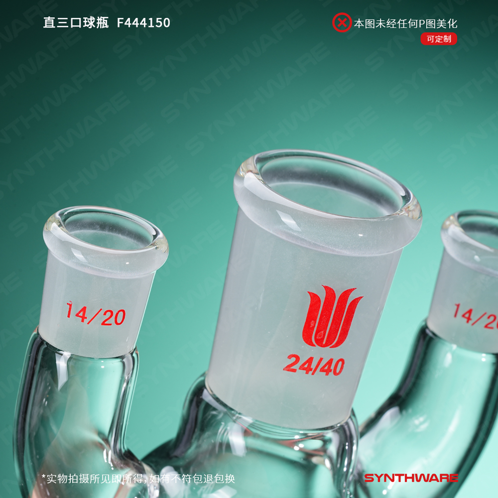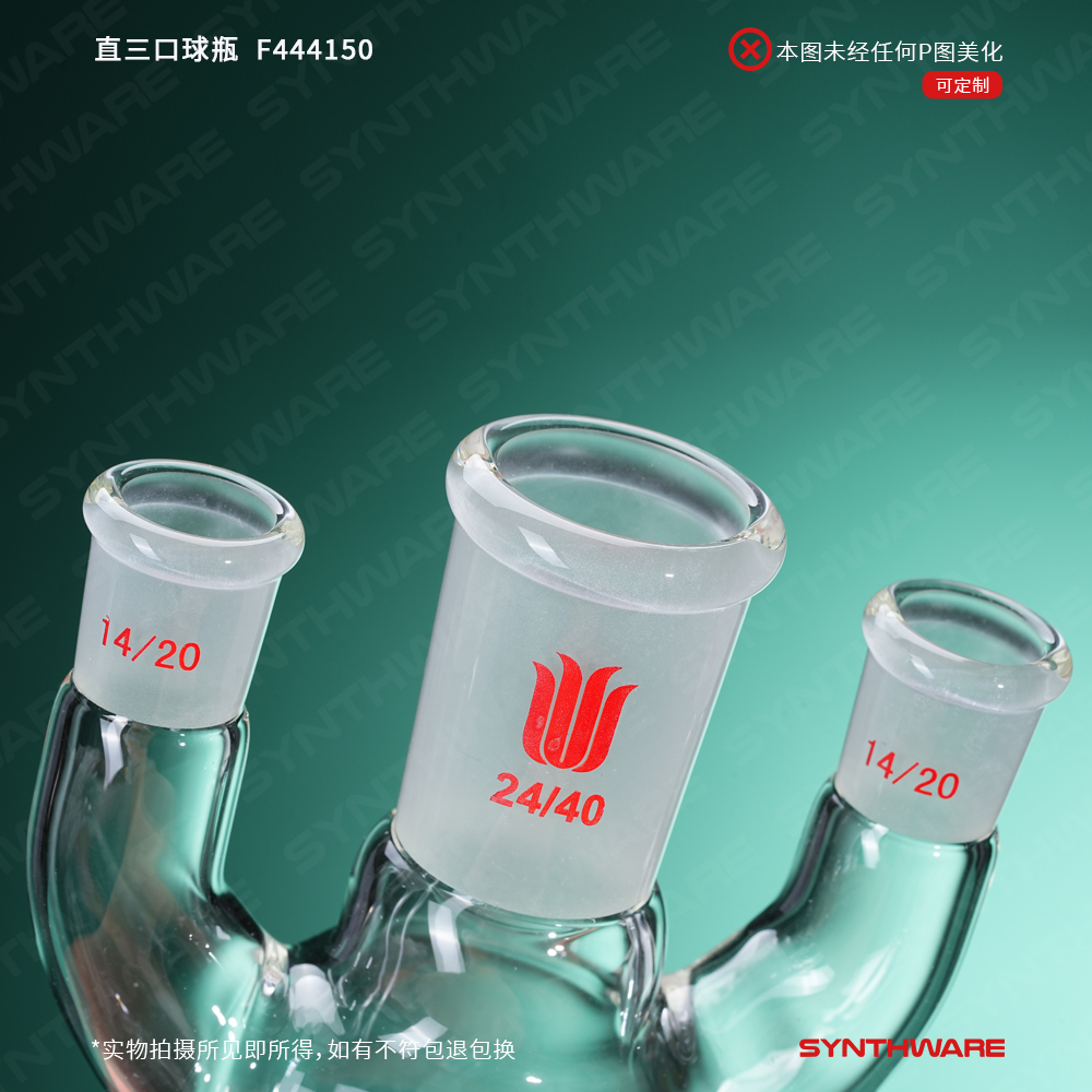 # 侧口可根据需求连接其他功能性接头或装置如:通气接头,冷凝器,加料漏斗等。不建议连接温度计或温度计套管产品,如果需要连接温度计,请选购F44X小角度三口瓶产品。