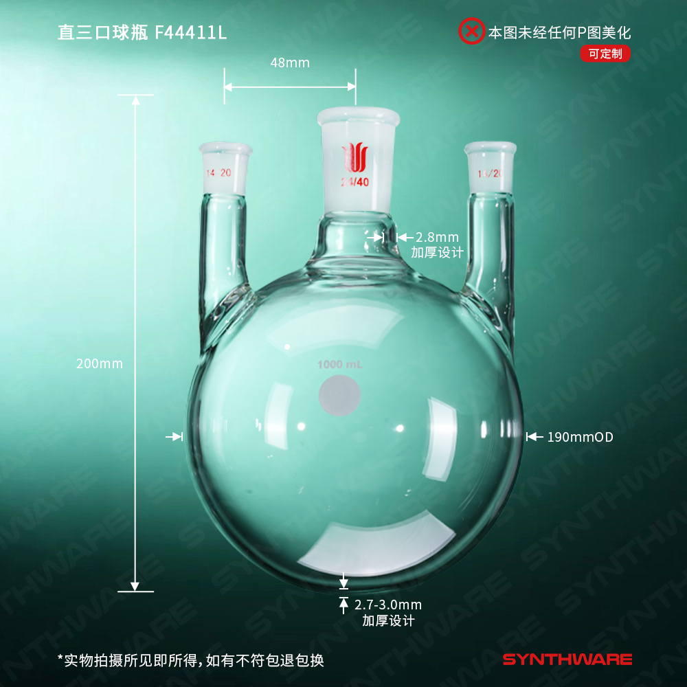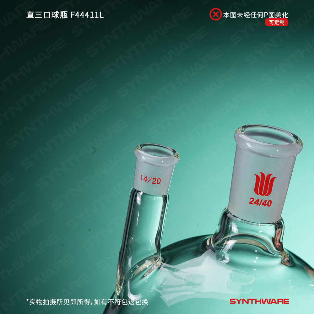 # 侧口可根据需求连接其他功能性接头或装置如:通气接头,冷凝器,加料漏斗等。不建议连接温度计或温度计套管产品,如果需要连接温度计,请选购F44X小角度三口瓶产品。