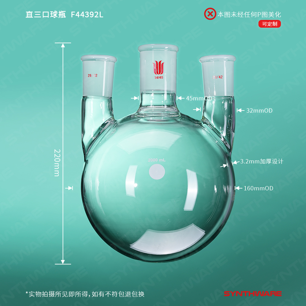 直三口球瓶,厚壁高强度,中间磨口:34/45,侧磨口:29/42,2000ml F44392L