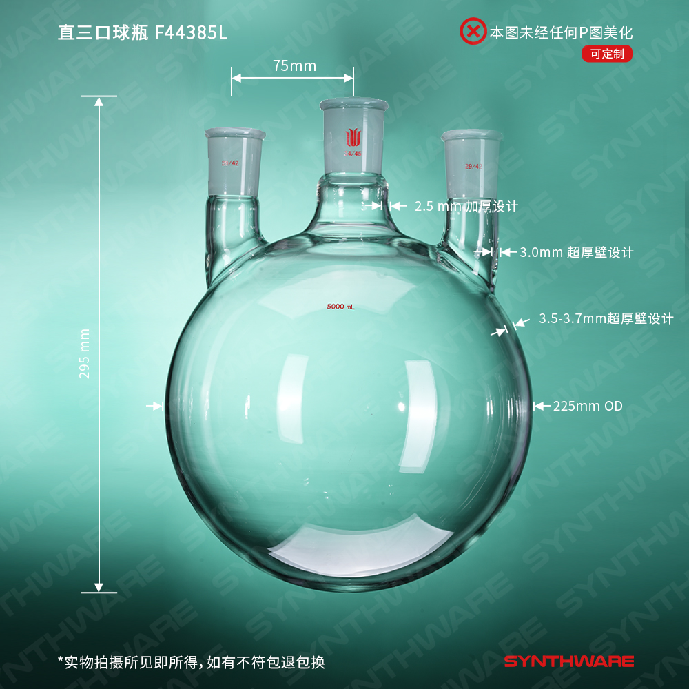 直三口球瓶,厚壁高强度,中间磨口:34/45,侧磨口:29/42,5000ml F44385L