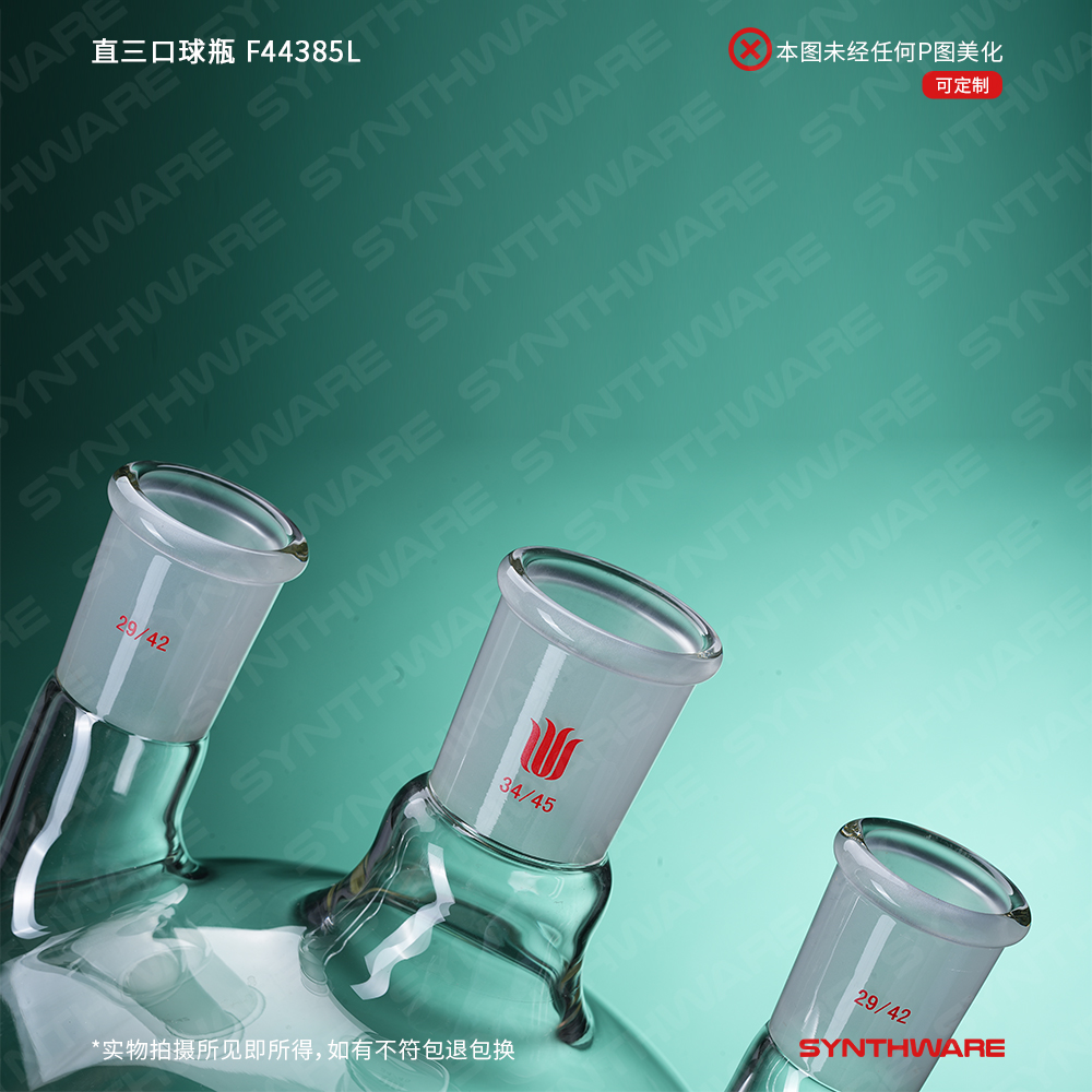 # 侧口可根据需求连接其他功能性接头或装置如:通气接头,冷凝器,加料漏斗等。不建议连接温度计或温度计套管产品,如果需要连接温度计,请选购F44X小角度三口瓶产品。