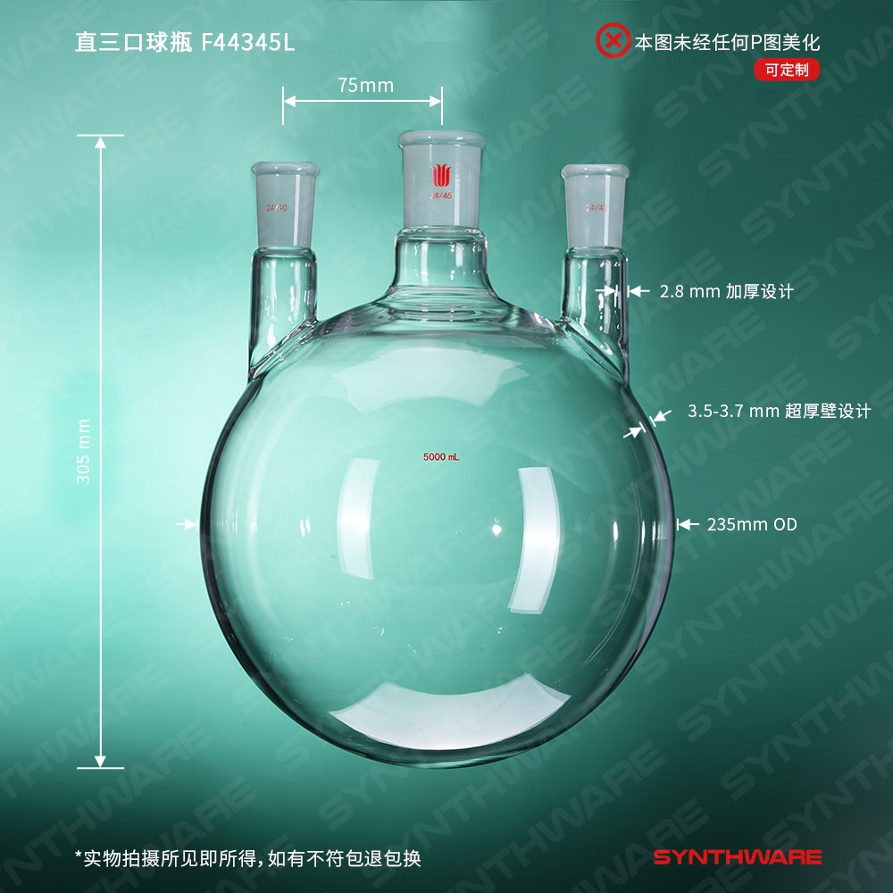 直三口球瓶,厚壁高强度,中间磨口:34/45,侧磨口:24/40,5000ml F44345L