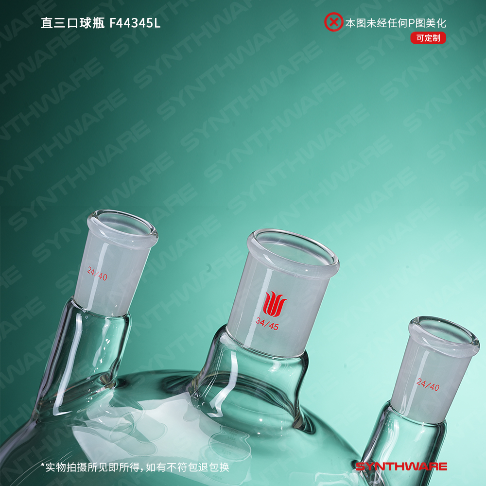 # 侧口可根据需求连接其他功能性接头或装置如:通气接头,冷凝器,加料漏斗等。不建议连接温度计或温度计套管产品,如果需要连接温度计,请选购F44X小角度三口瓶产品。