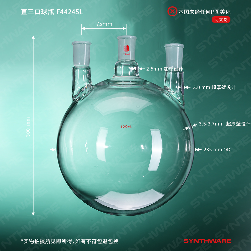 直三口球瓶,厚壁高强度,中间磨口:24/40,侧磨口:24/40,5000ml F44245L