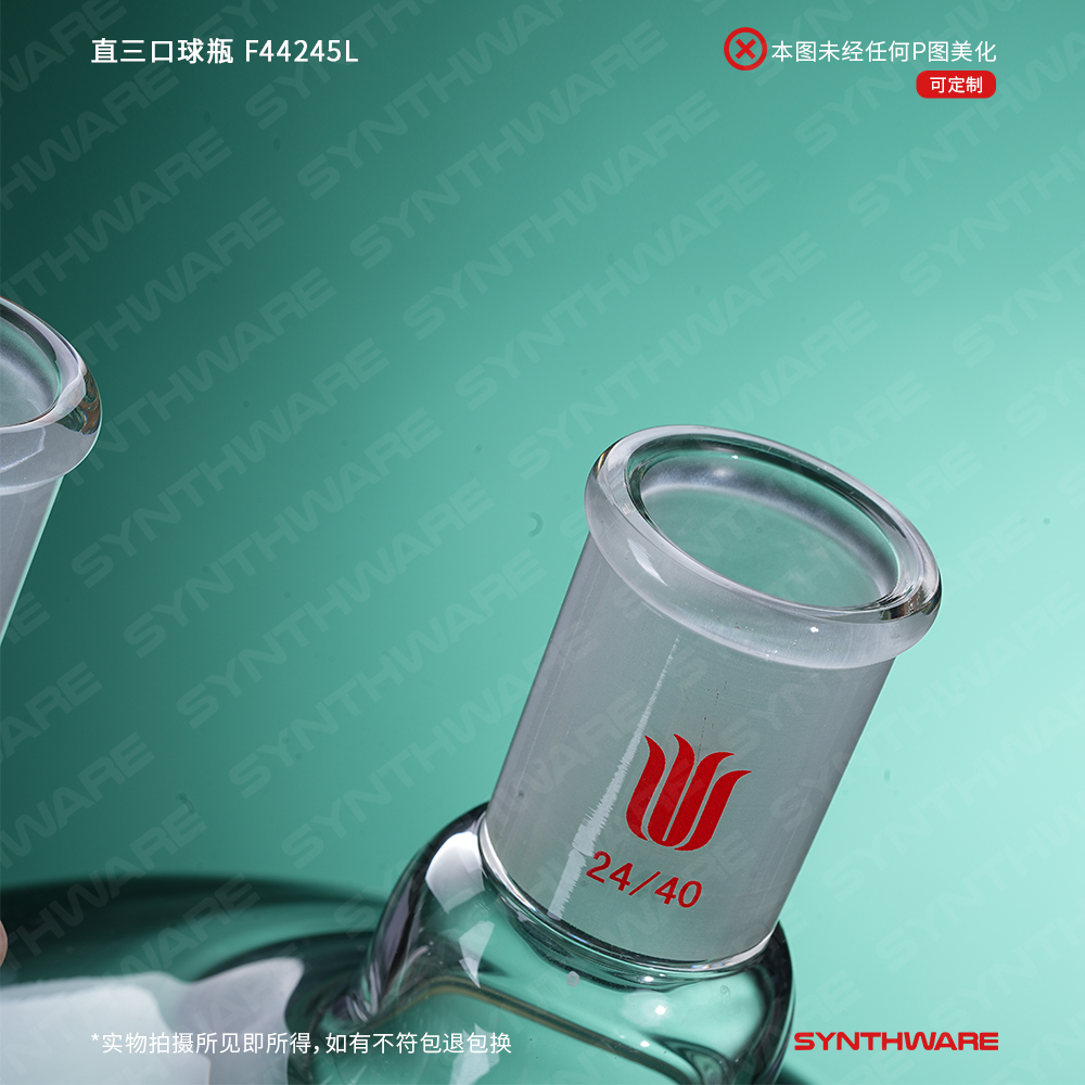 # 侧口可根据需求连接其他功能性接头或装置如:通气接头,冷凝器,加料漏斗等。不建议连接温度计或温度计套管产品,如果需要连接温度计,请选购F44X小角度三口瓶产品。
