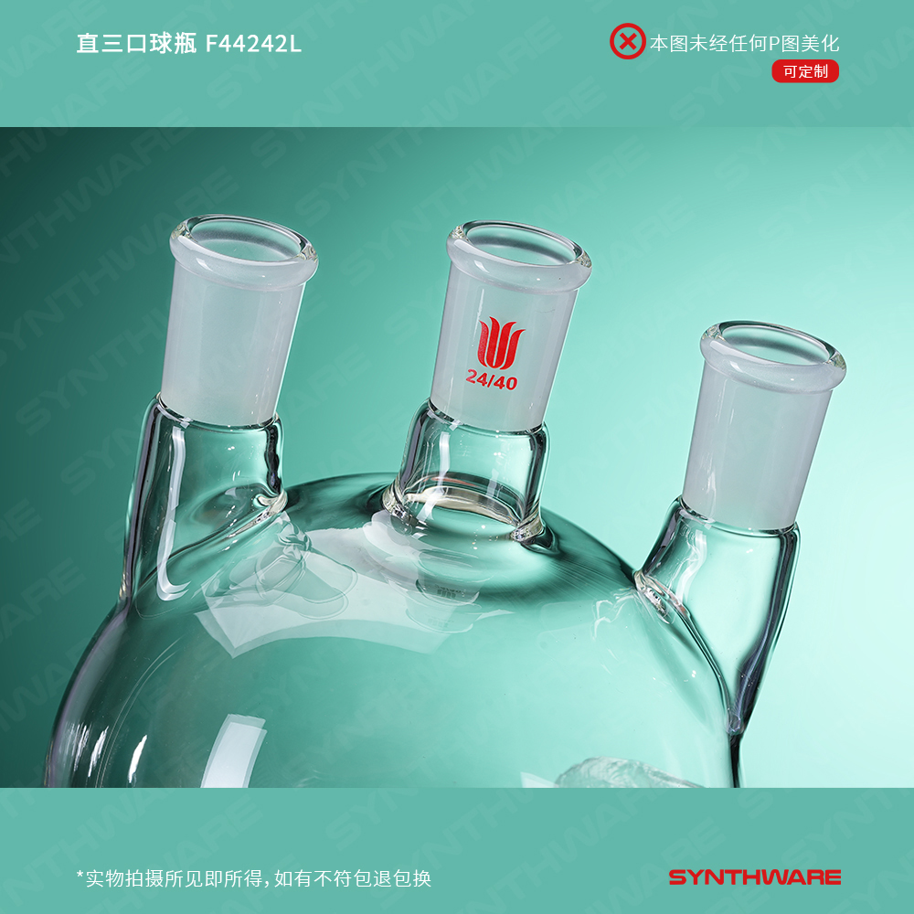 # 侧口可根据需求连接其他功能性接头或装置如:通气接头,冷凝器,加料漏斗等。不建议连接温度计或温度计套管产品,如果需要连接温度计,请选购F44X小角度三口瓶产品。