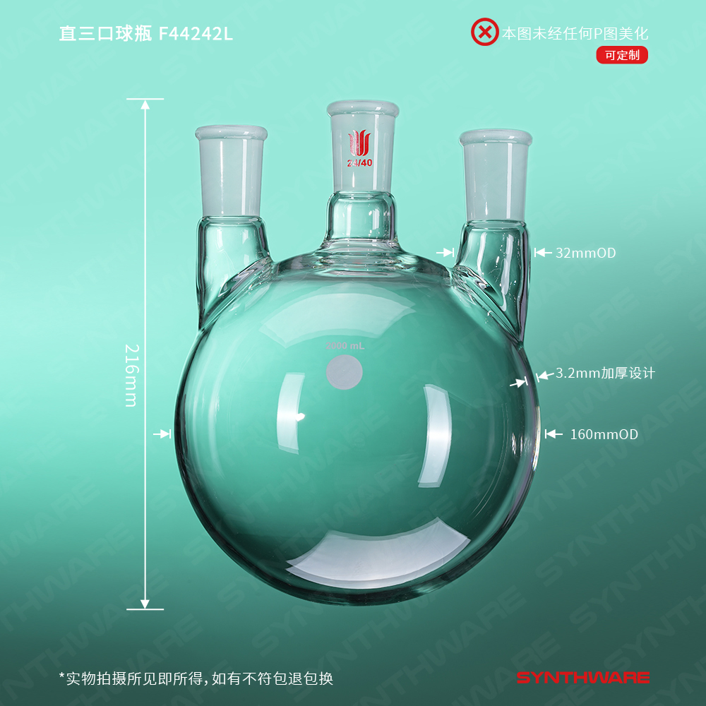直三口球瓶,厚壁高强度,中间磨口:24/40,侧磨口:24/40,2000ml F44242L