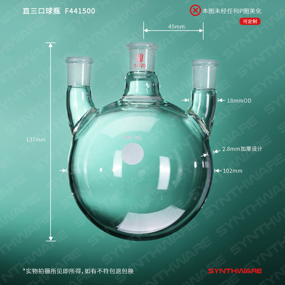 # 侧口可根据需求连接其他功能性接头或装置如:通气接头,冷凝器,加料漏斗等。不建议连接温度计或温度计套管产品,如果需要连接温度计,请选购F44X小角度三口瓶产品。