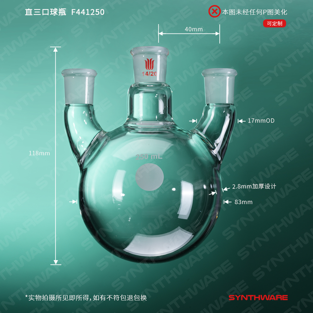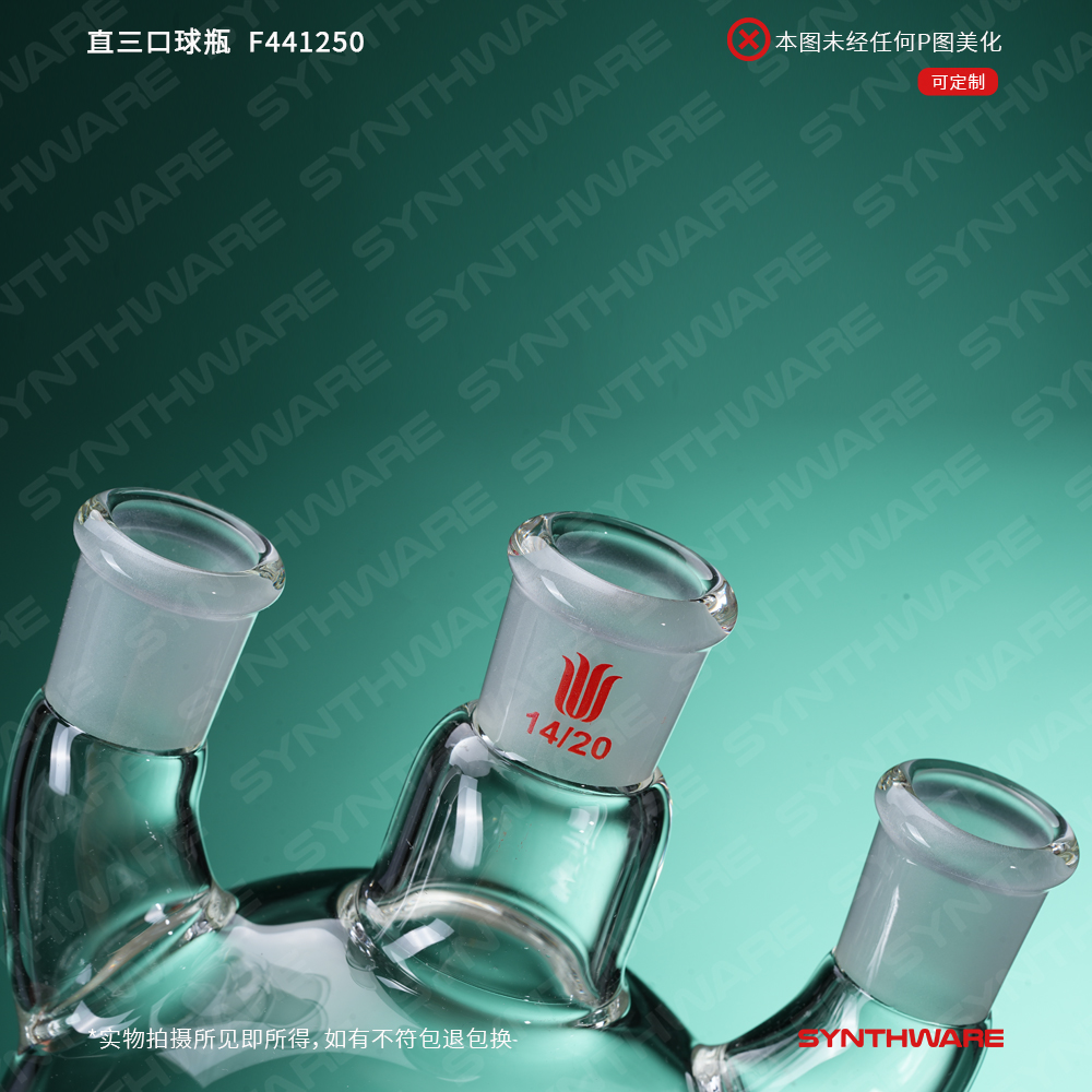 # 侧口可根据需求连接其他功能性接头或装置如:通气接头,冷凝器,加料漏斗等。不建议连接温度计或温度计套管产品,如果需要连接温度计,请选购F44X小角度三口瓶产品。
