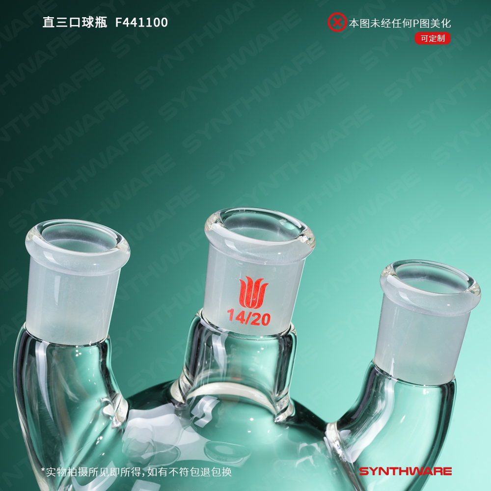 直三口球瓶,厚壁高强度,中间磨口:14/20,侧磨口:14/20,100ml F441100