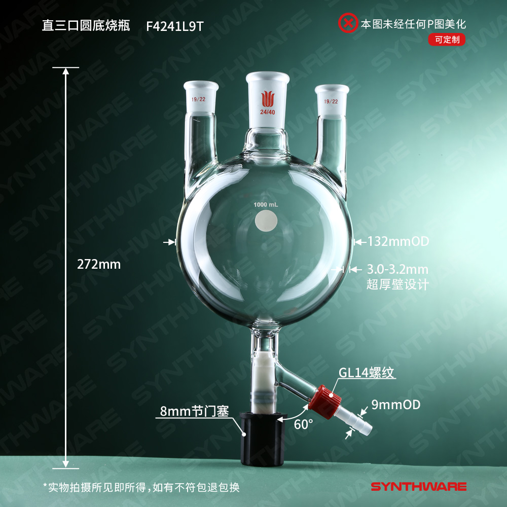 直三口圆底烧瓶,具8mm高真空,主口24/40,侧口19/22,1000ml F4241L9T