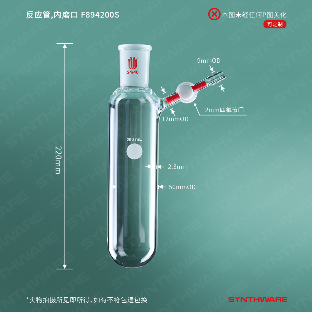 反应管,内磨口24/40,具2mm四氟节门,200ml F894200S