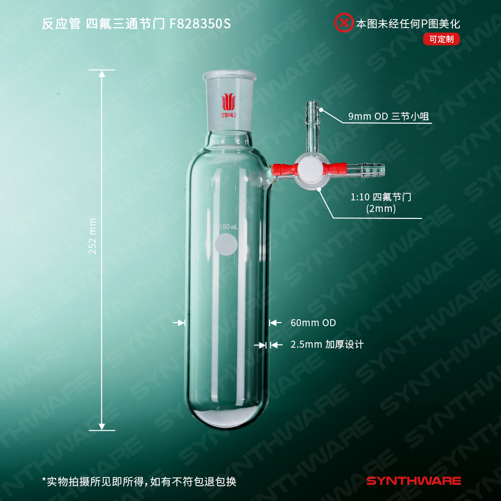 反应管,四氟三通节门,磨口:29/42,容量:350ml F828350S