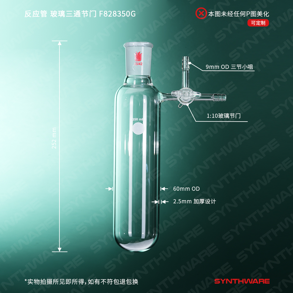 反应管,玻璃三通节门,磨口:24/40,容量:350ml F824350G