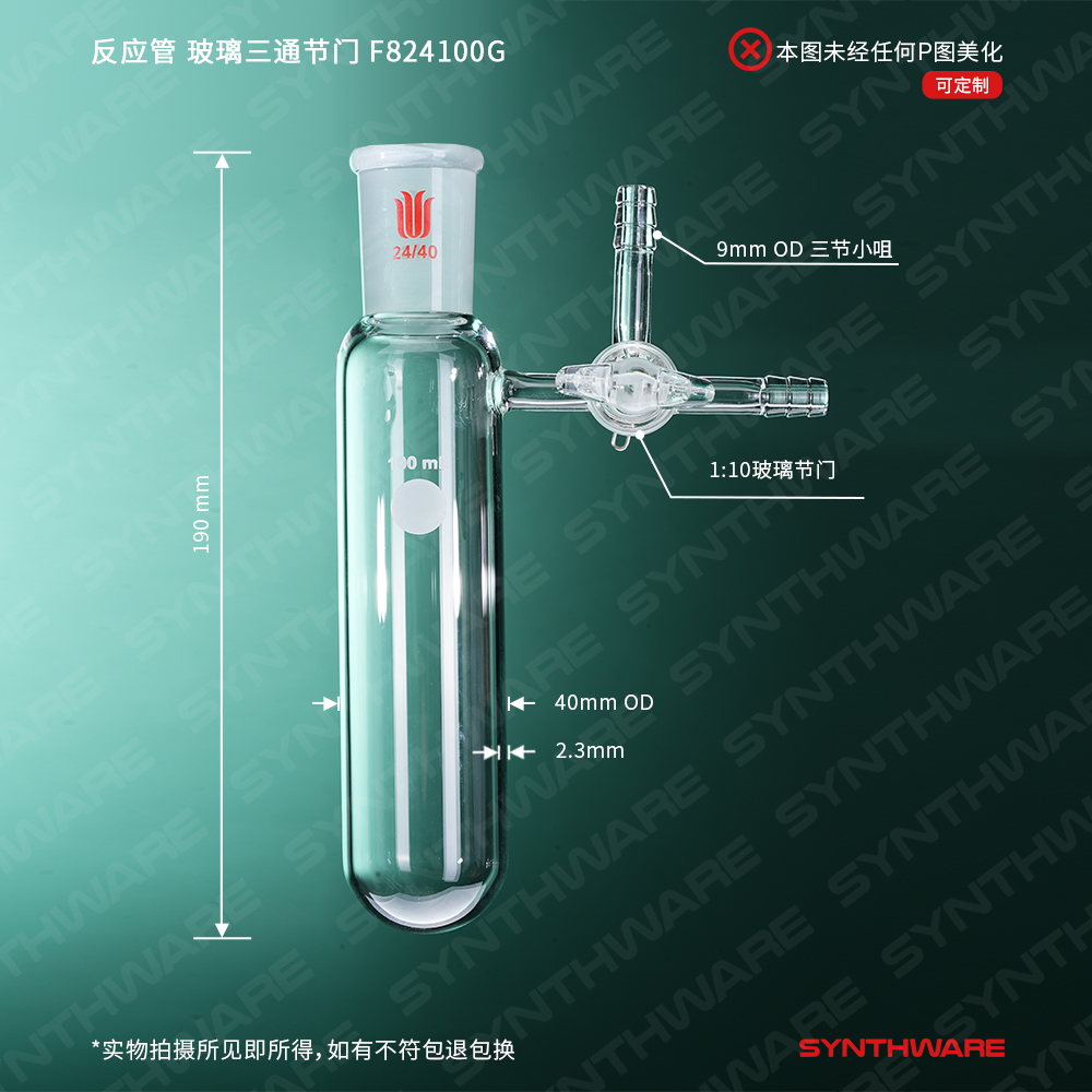 反应管,玻璃三通节门,磨口:24/40,容量:100ml F824100G