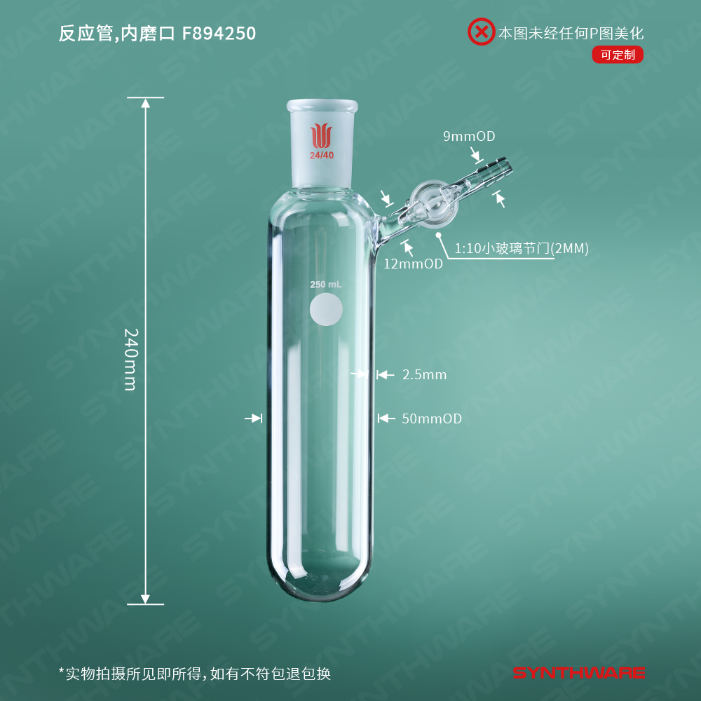 反应管,内磨口24/40,具2mm玻璃节门,250ml F894250