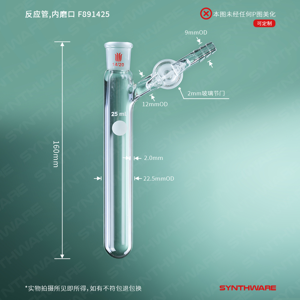 反应管,内磨口14/20,具2mm玻璃节门,25ml F891425