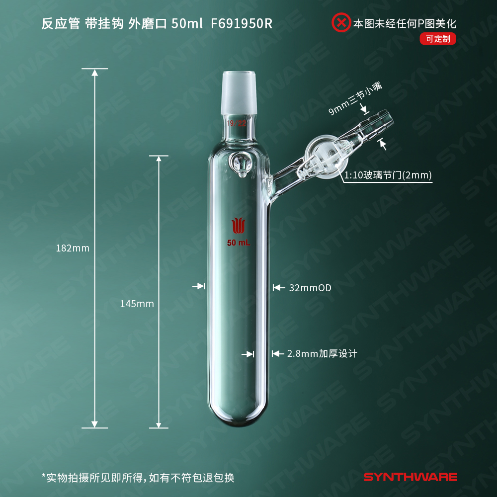 反应管,带挂钩 外磨口19/22,玻璃节门,100ml F699100R