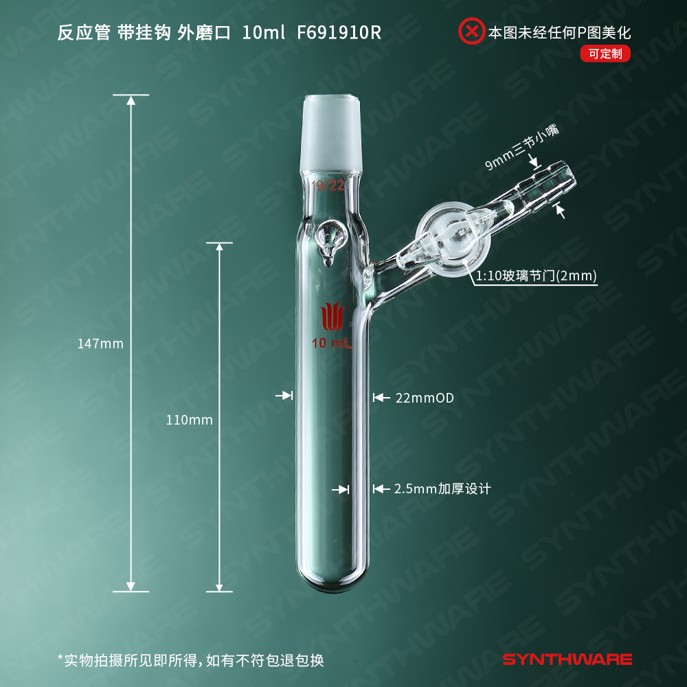 反应管,带挂钩 外磨口19/22,玻璃节门,10ml F691910R
