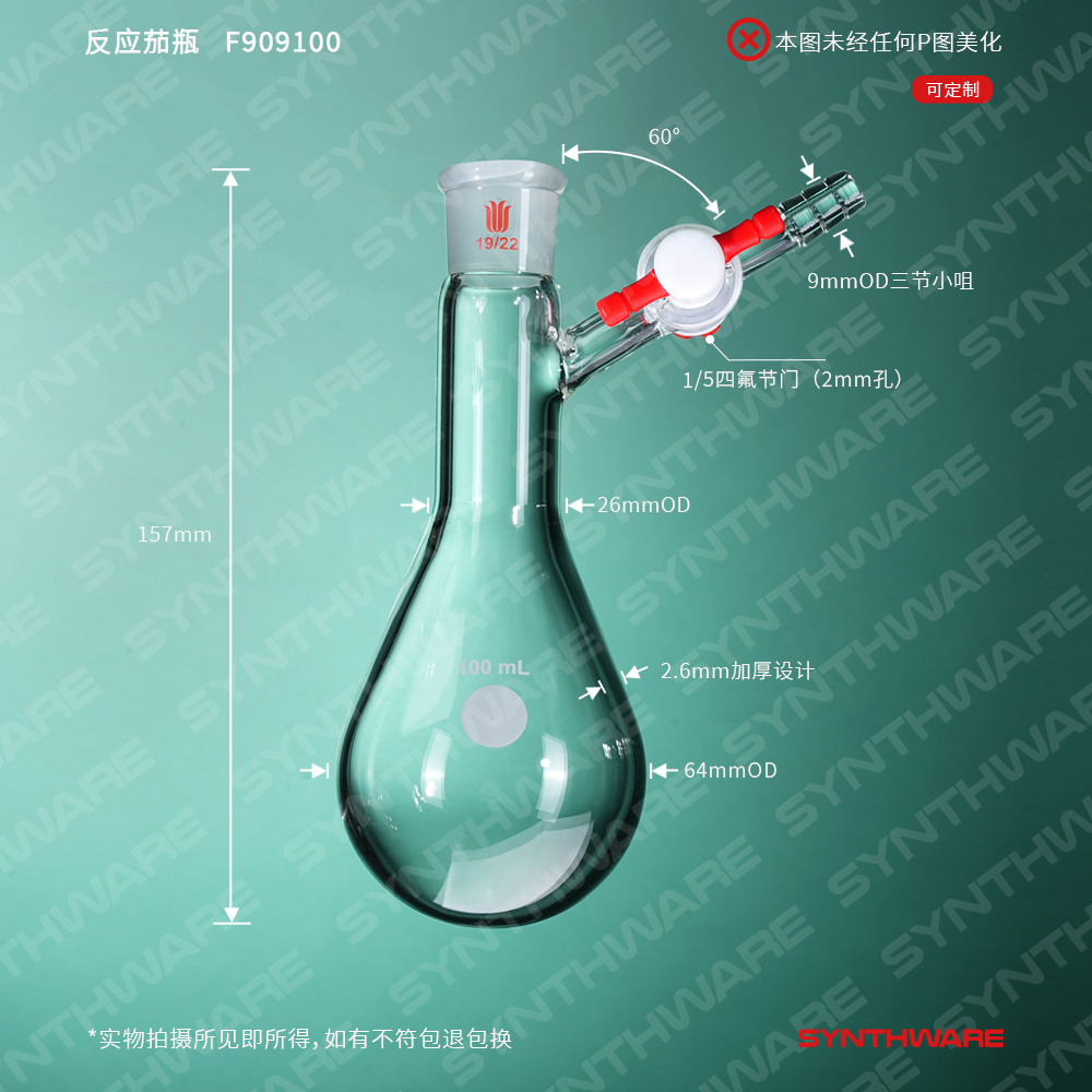 反应茄瓶,磨口:19/22,100ml,四氟节门 F909100