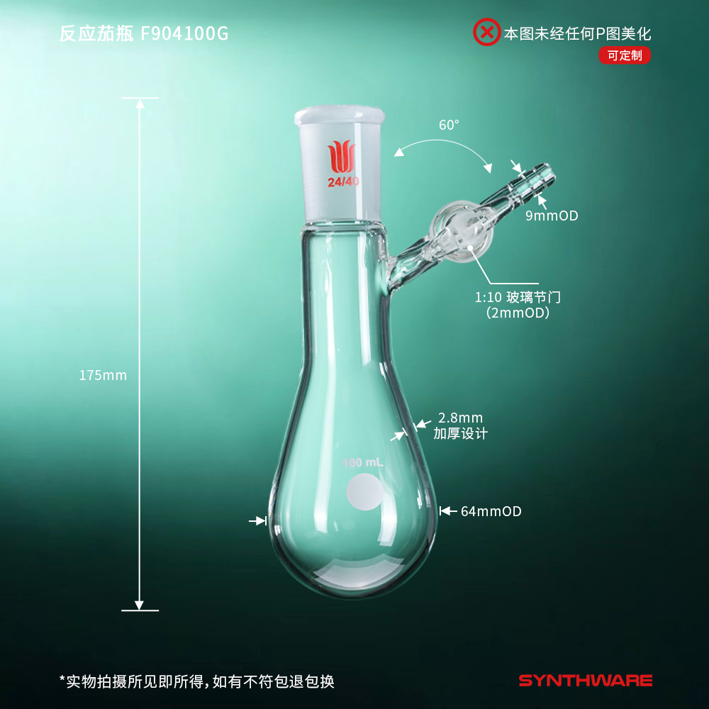 反应茄瓶,磨口:24/40,100ml,玻璃节门 F904100G