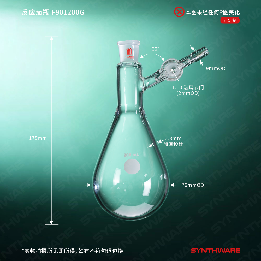 反应茄瓶,磨口:14/20,200ml,玻璃节门 F901200G