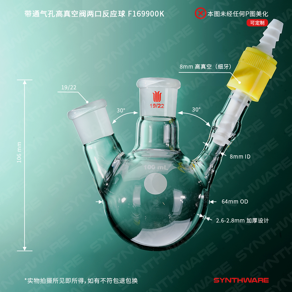 带通气孔高真空阀两口反应球瓶,主口19/22,侧口19/22,容量100m F169900K
