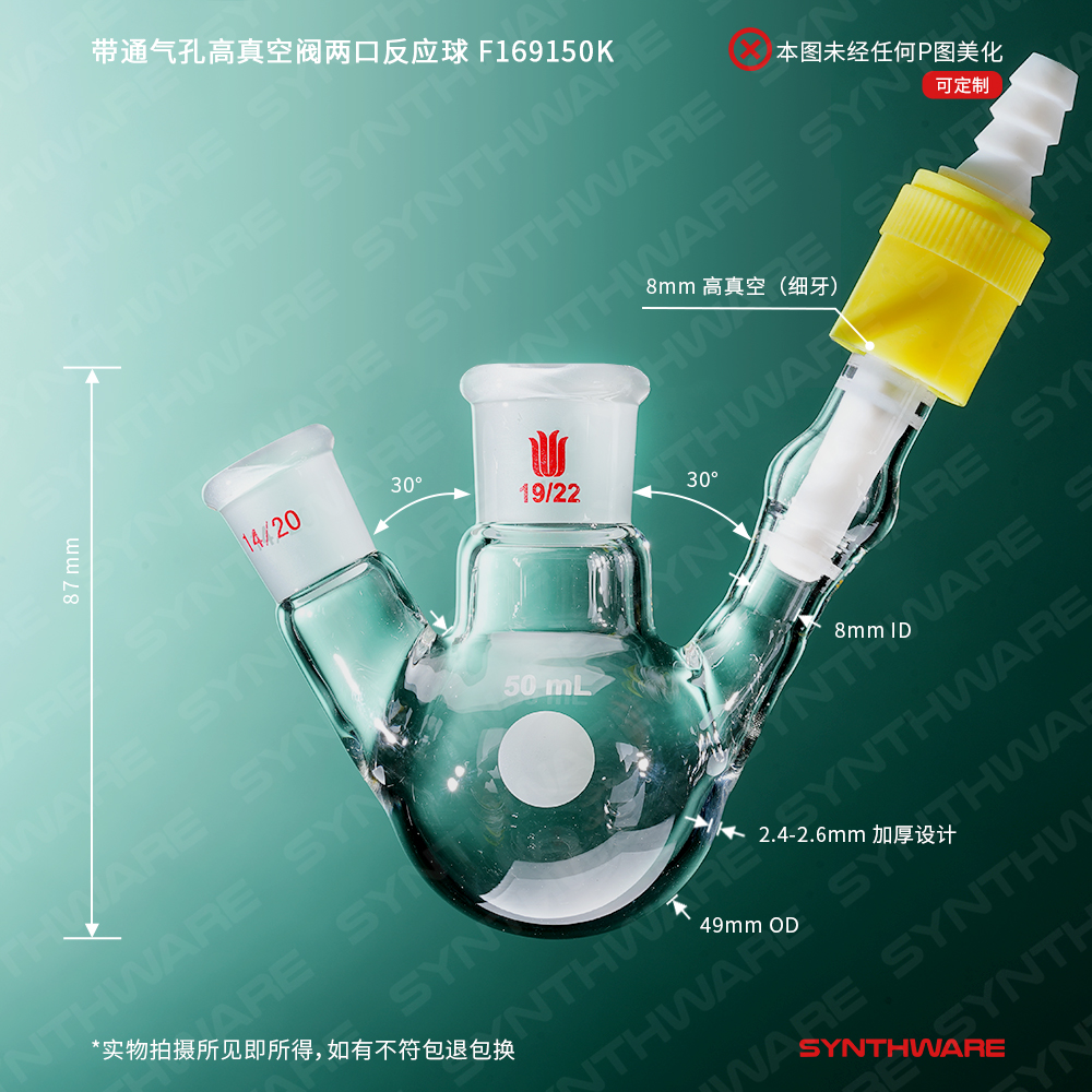 带通气孔高真空阀两口反应球瓶,主口19/22,侧口14/20,容量50ml F169150K