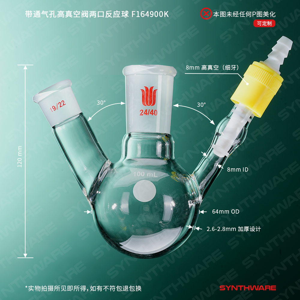 带通气孔高真空阀两口反应球瓶,主口19/22,侧口19/22,容量100m F169900K