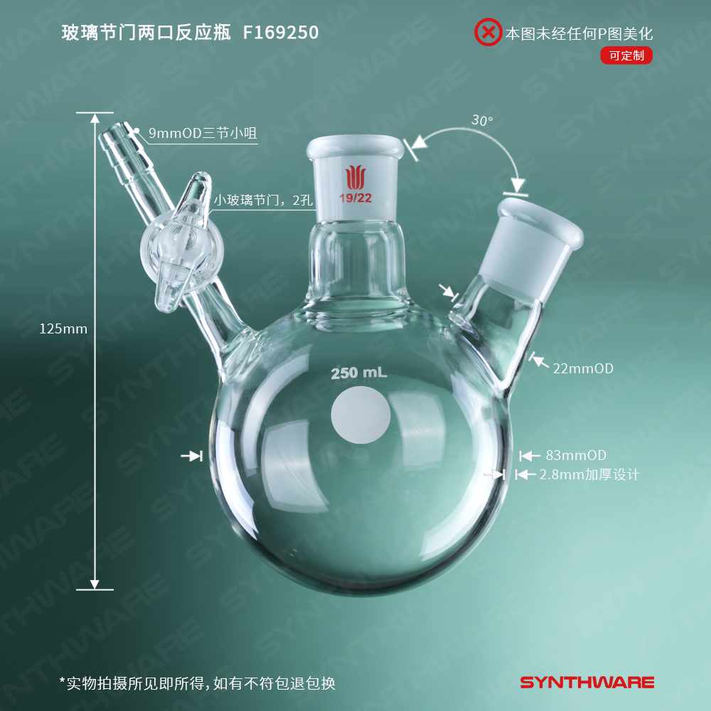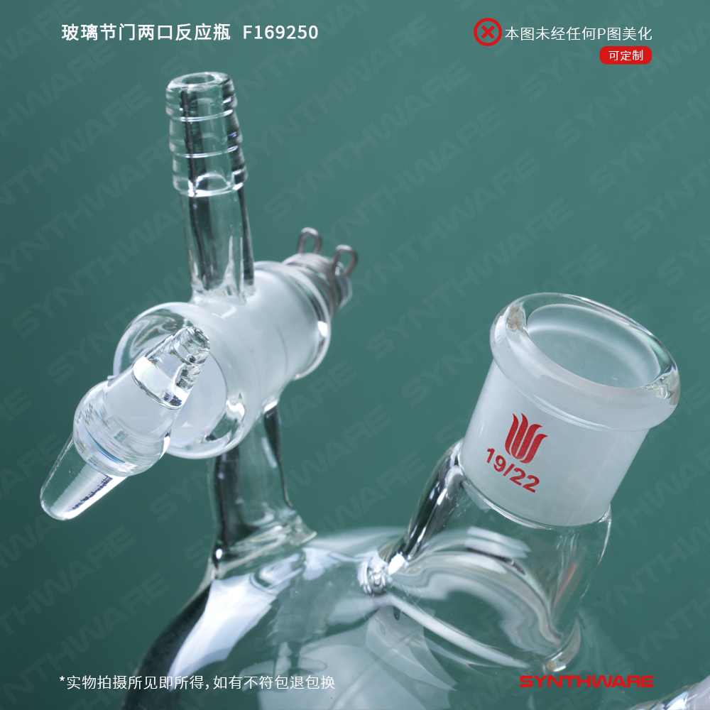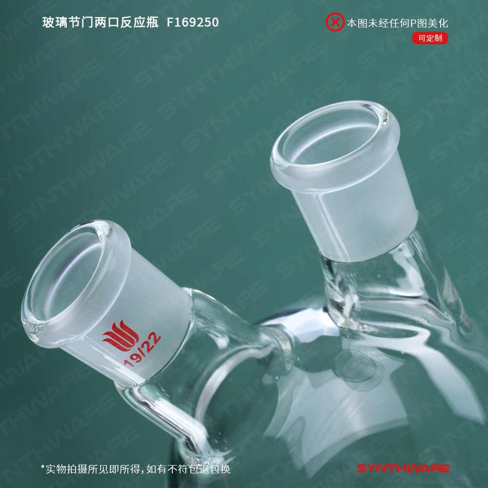 # 此款反应瓶具有两个标准磨口和一个玻璃节门。内磨口由400目金刚砂研磨,保证密封性。