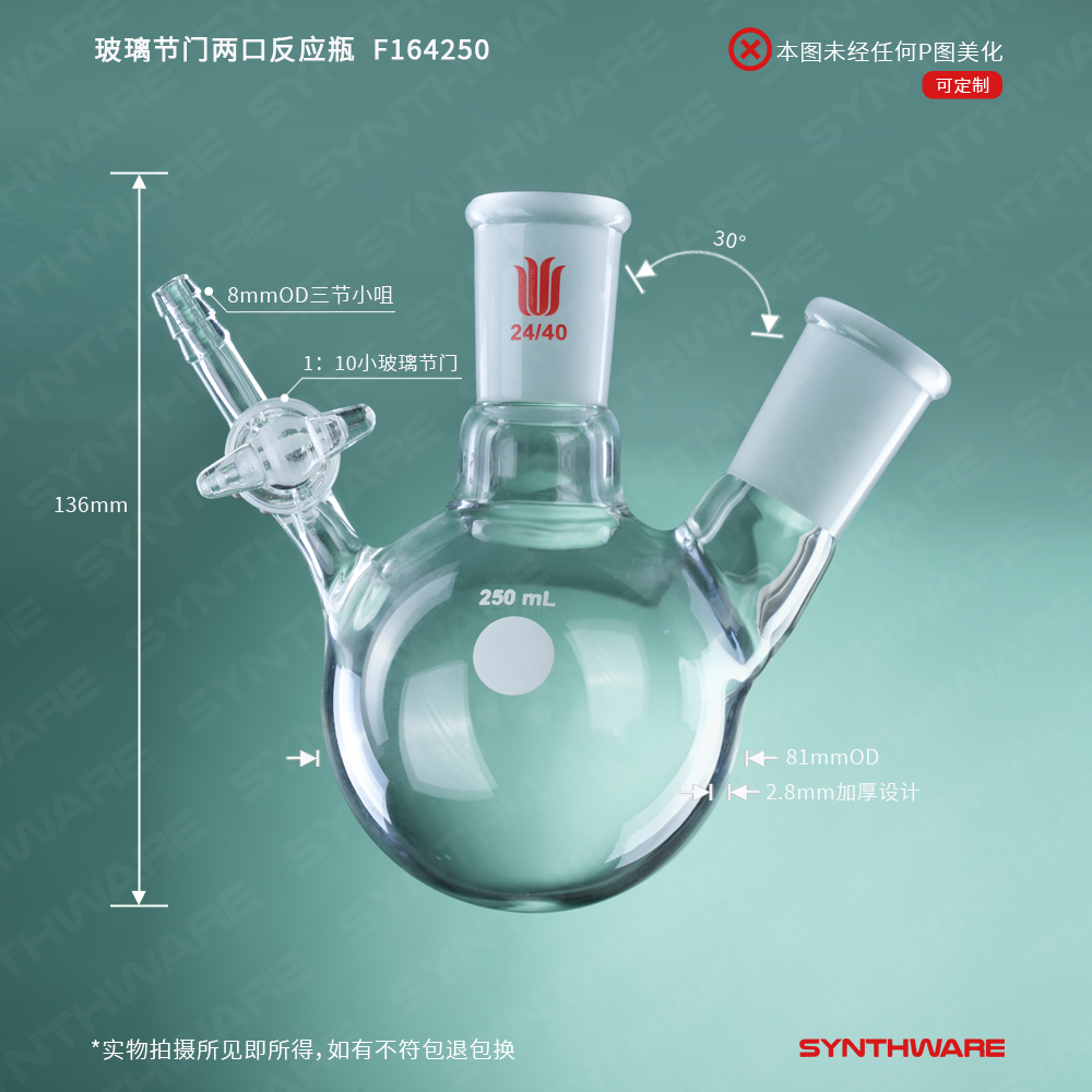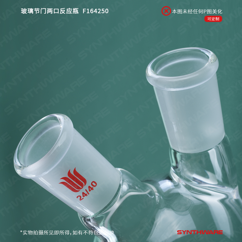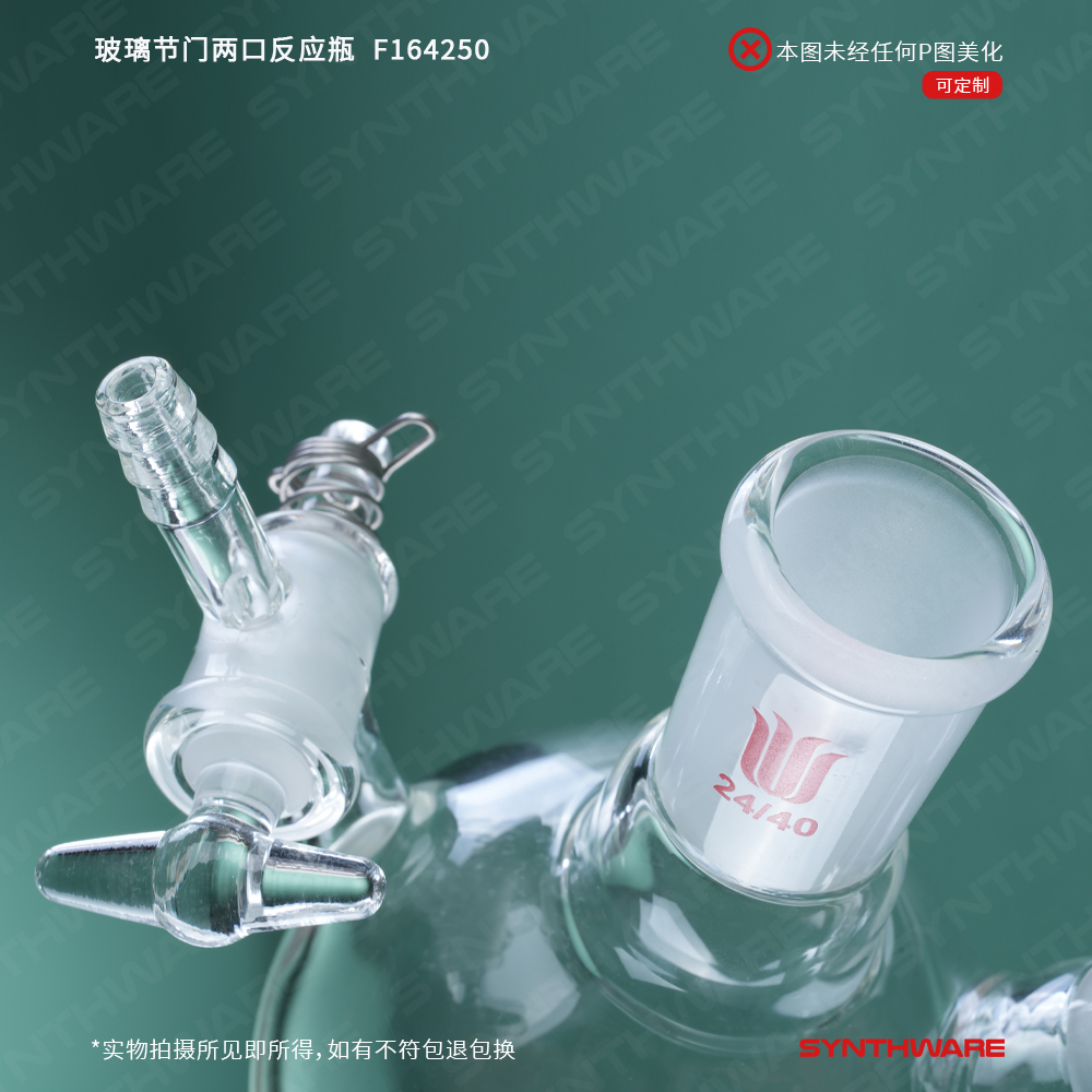 # 此款反应瓶具有两个标准磨口和一个玻璃节门。内磨口由400目金刚砂研磨,保证密封性。