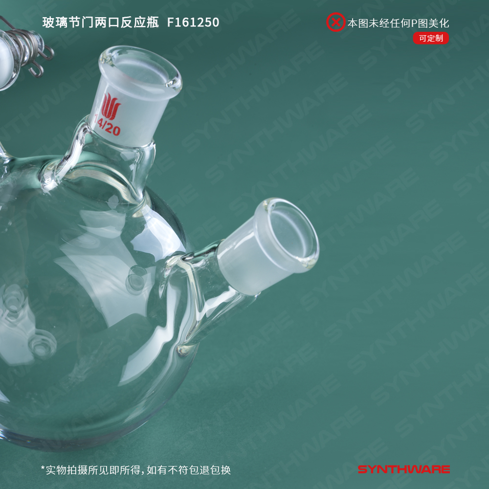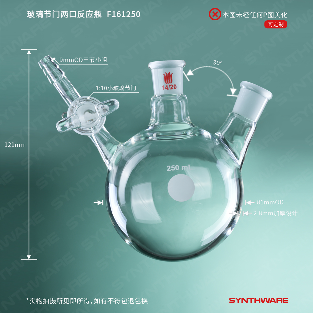 玻璃节门两口反应瓶,容量:250ml,主口:14/20,侧口:14/20 F161250