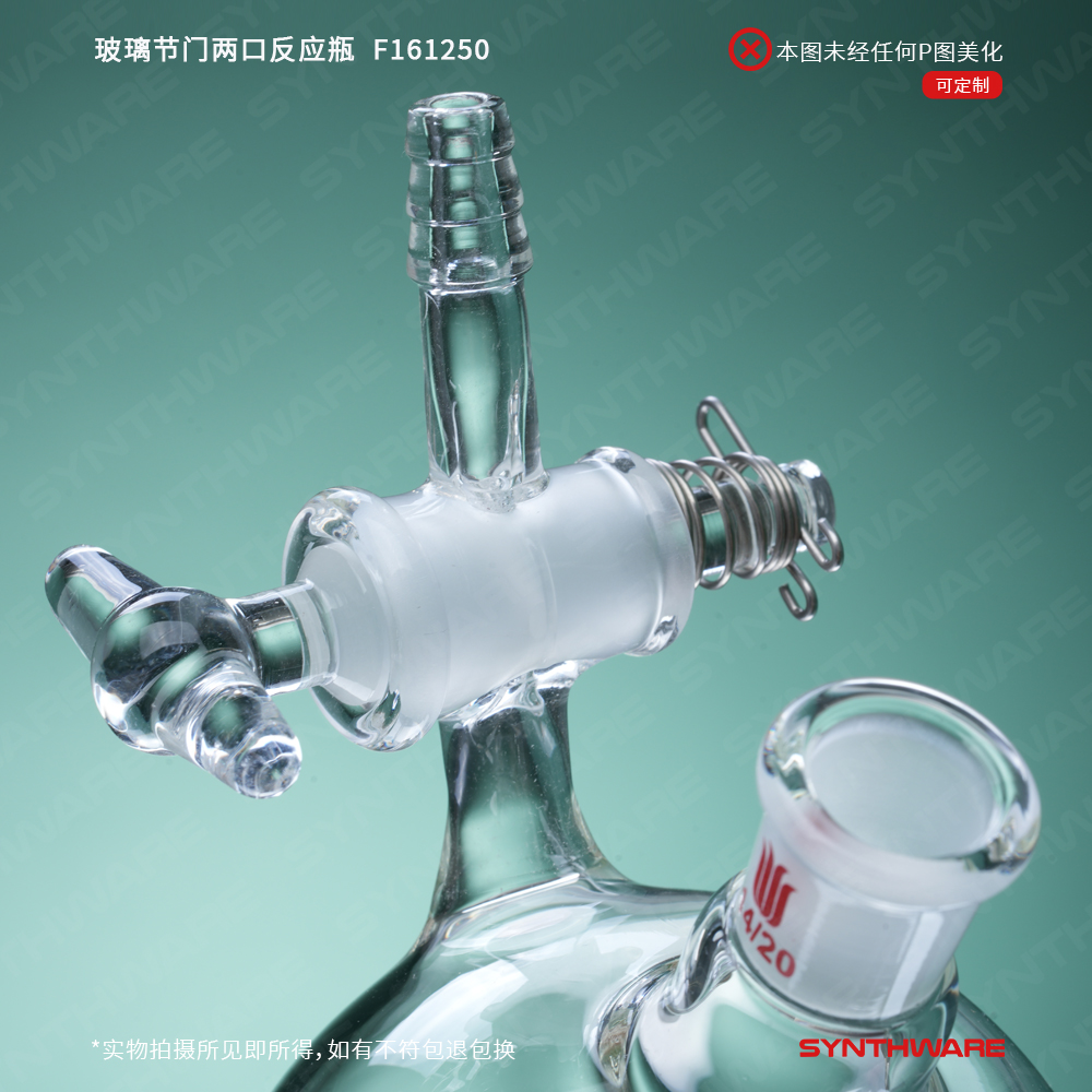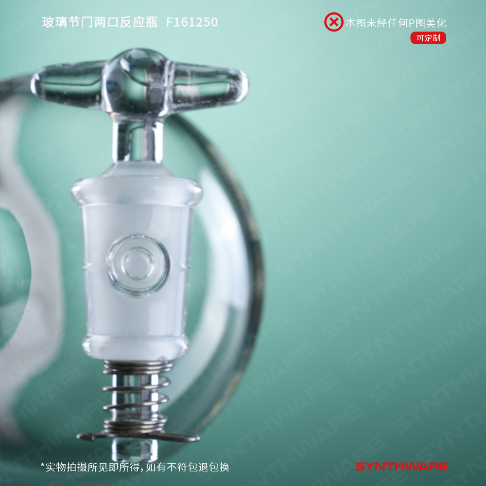 # 此款反应瓶具有两个标准磨口和一个玻璃节门。内磨口由400目金刚砂研磨,保证密封性。