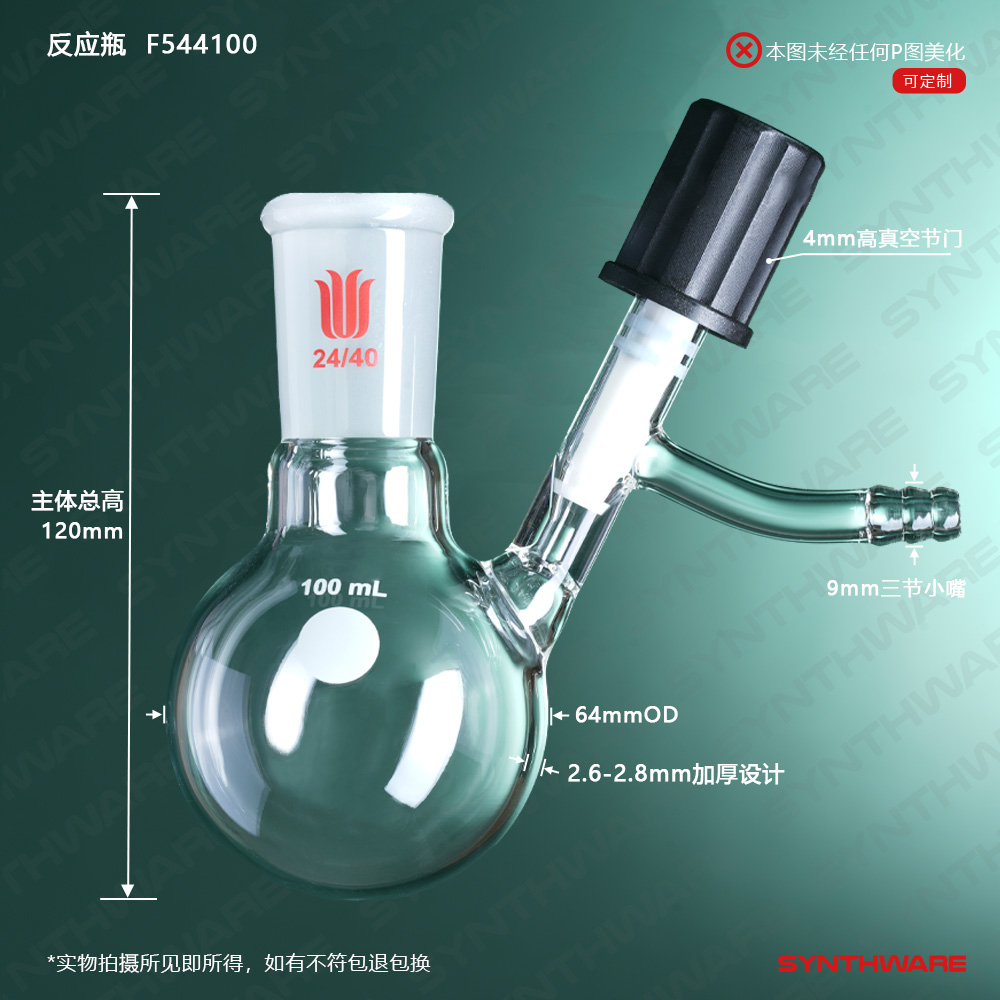 反应瓶,4mm高真空阀,100ml,24/40 F544100