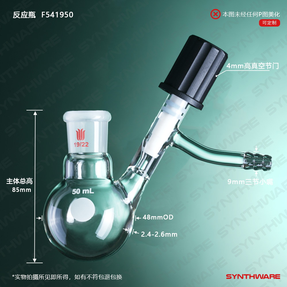 反应瓶 > 球型反应瓶 > 高真空节门-单口球型反应瓶 > SYNTHWARE > 反应瓶,4mm高真空阀,50ml,19/22 F541950
