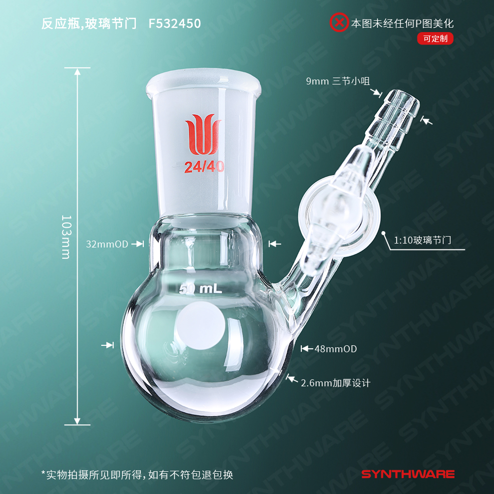 反应瓶,玻璃节门,24/40,50ml F532450