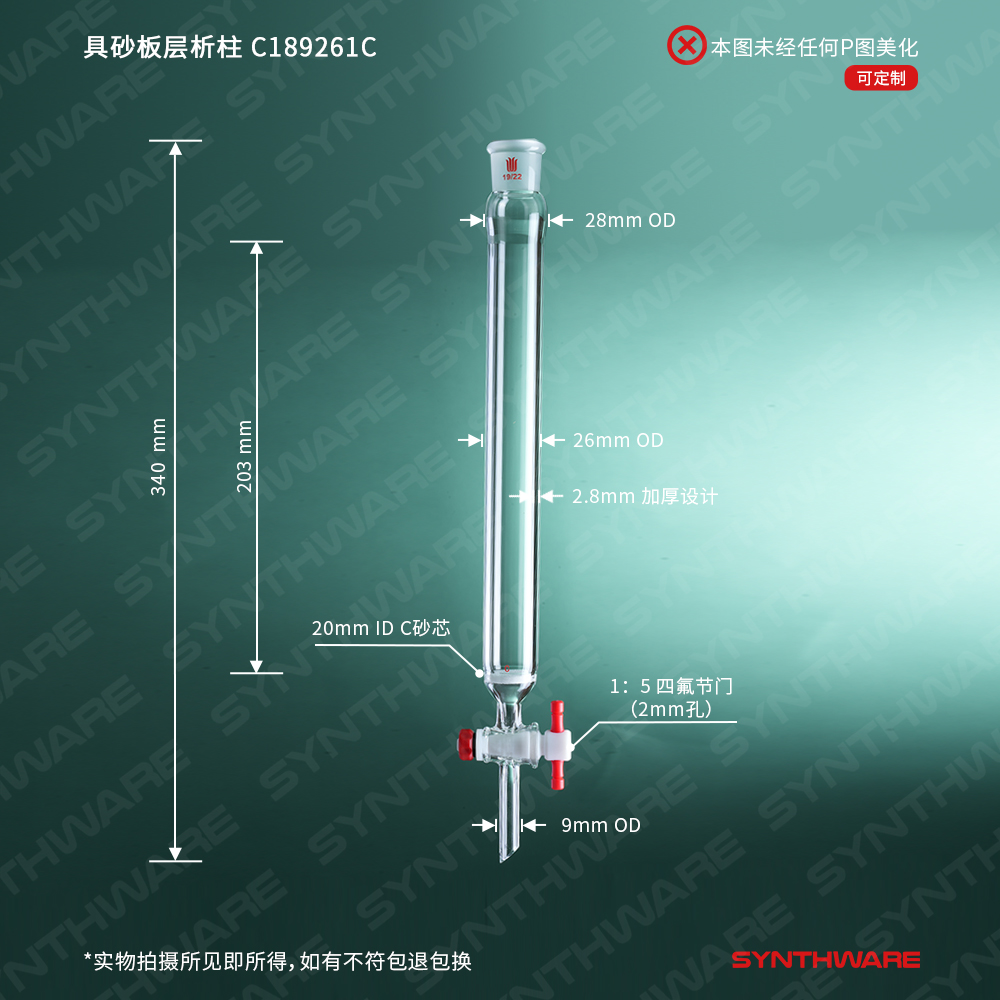 层析类 > 层析柱 > 具砂板闪式层析柱 > SYNTHWARE > 具砂板层析柱,φ26mm,有效长203mm,节门孔径:2mm,19/22 C189261C