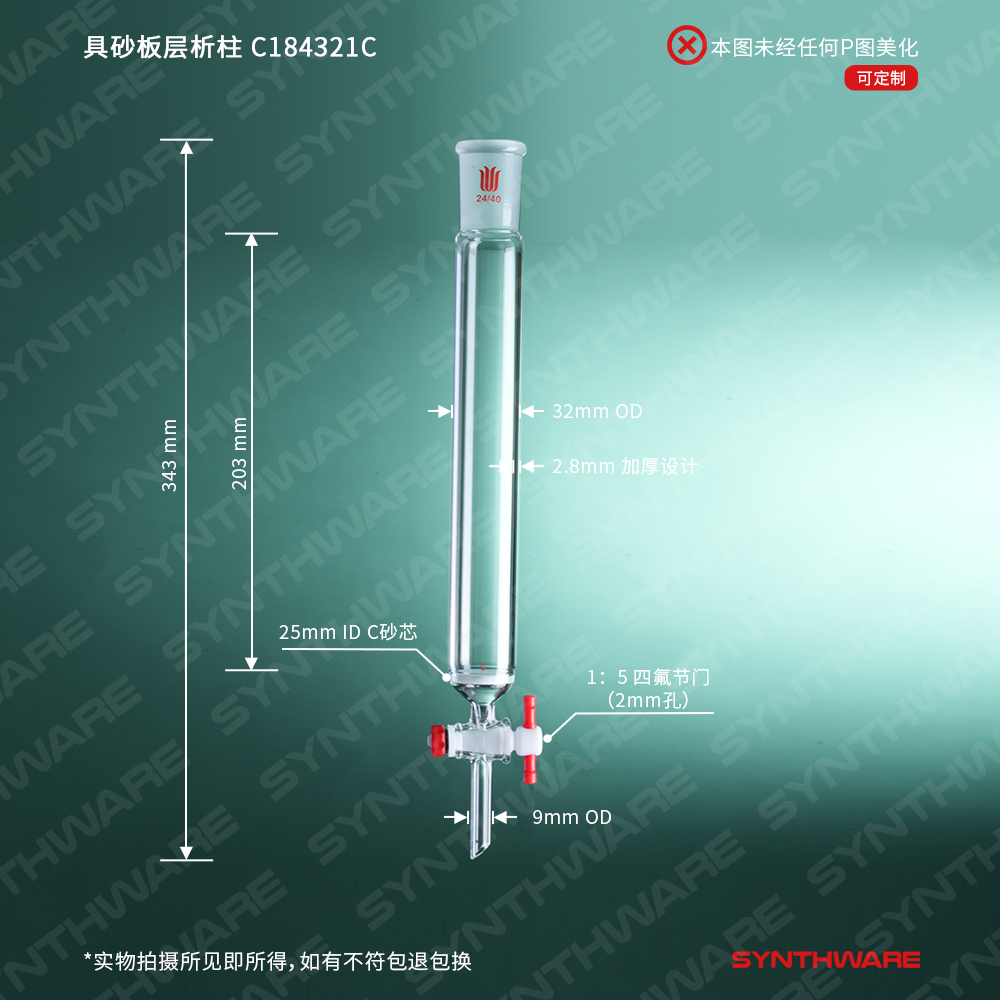 层析类 > 层析柱 > 具砂板闪式层析柱 > SYNTHWARE > 具砂板层析柱,φ32mm,有效长203mm,节门孔径:2mm,24/40 C184321C