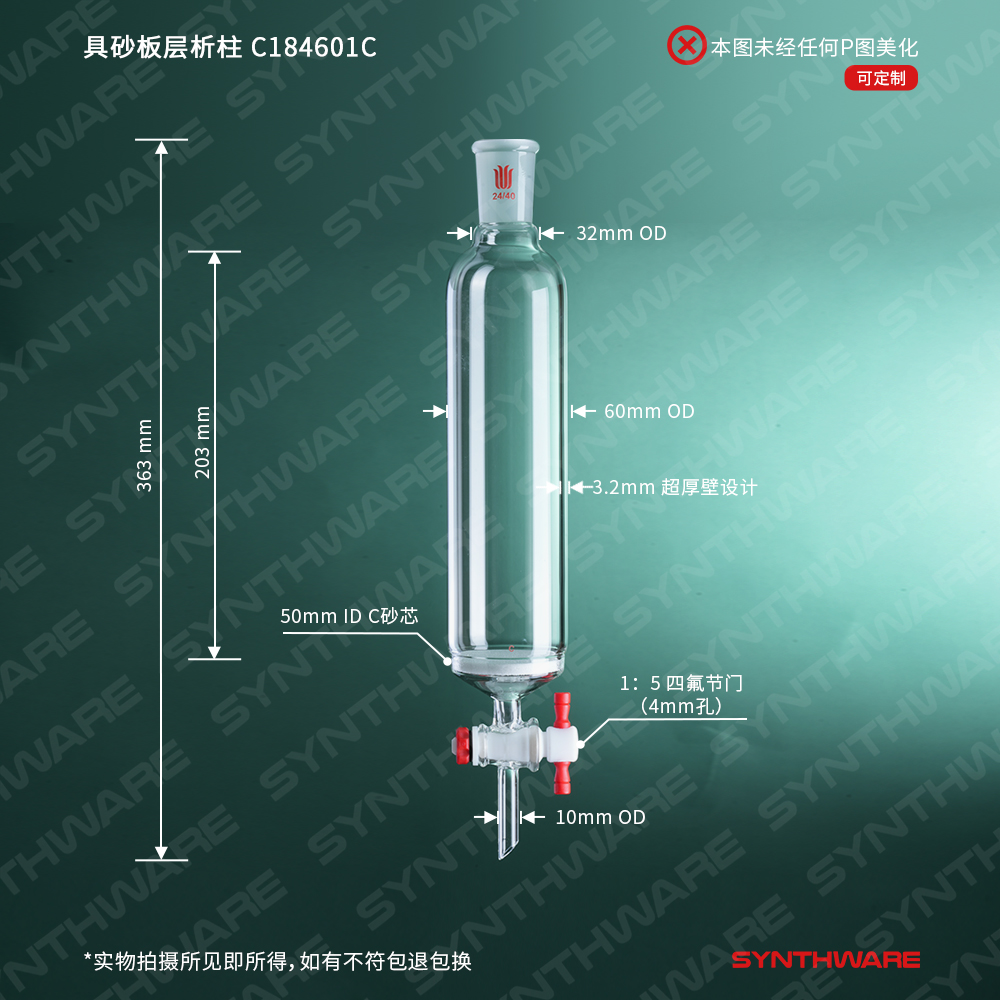 层析类 > 层析柱 > 具砂板闪式层析柱 > SYNTHWARE > 具砂板层析柱,φ60mm,有效长203mm,节门孔径:4mm,24/40 C184601C