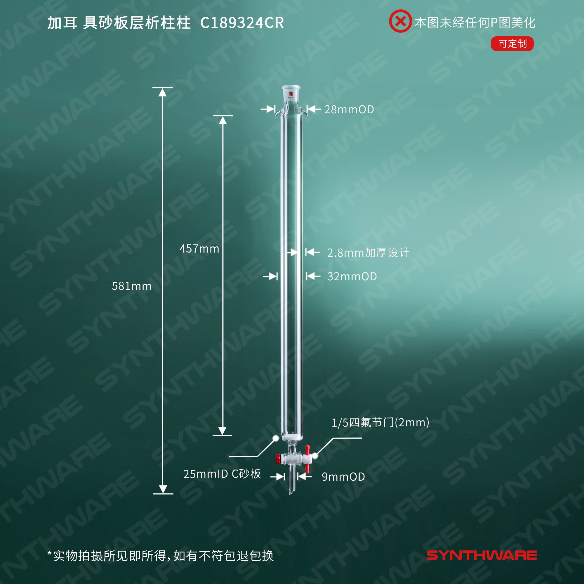 层析类 > 层析柱 > 带挂钩-具砂板闪式层析柱 > SYNTHWARE > 加耳 具砂板层析柱,φ32mm,有效长457mm,节门孔径:2mm,19/22 C189324CR