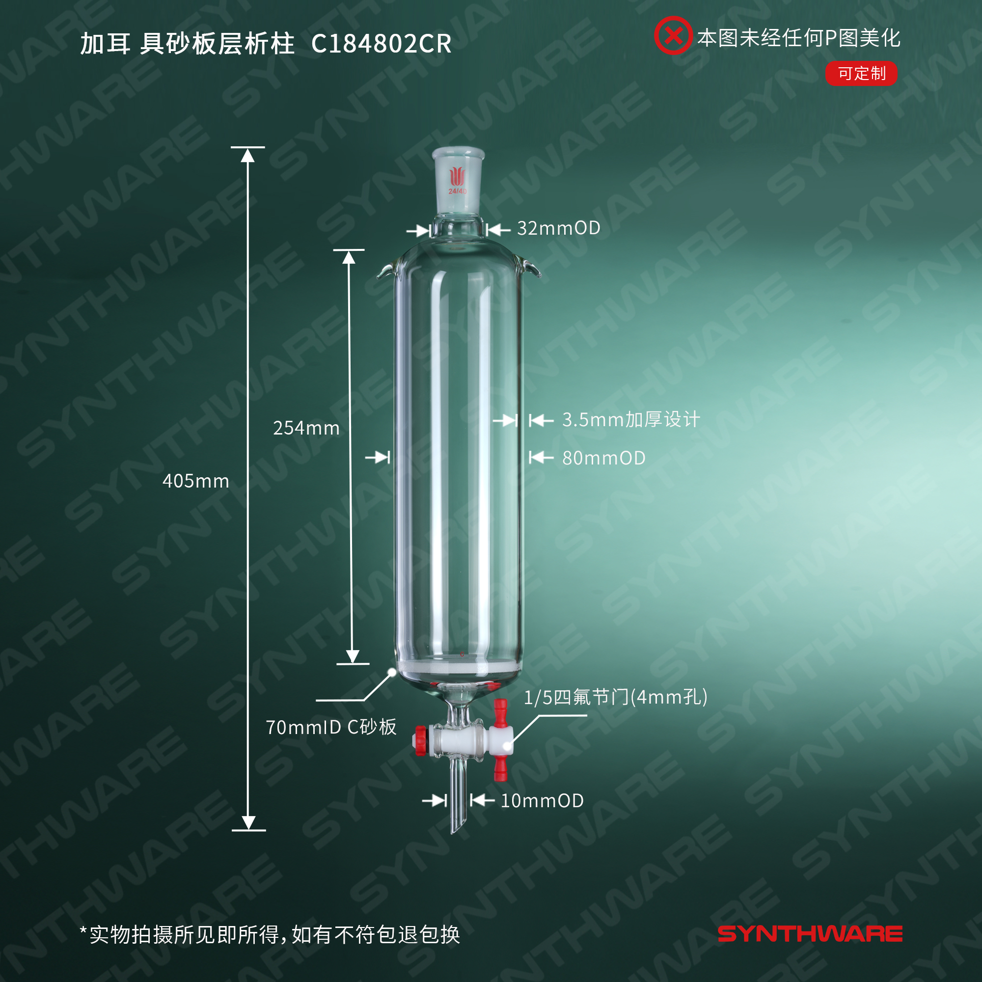 层析类 > 层析柱 > 带挂钩-具砂板闪式层析柱 > SYNTHWARE > 加耳 具砂板层析柱,φ80mm,有效长254mm,节门孔径:4mm,24/40 C184802CR