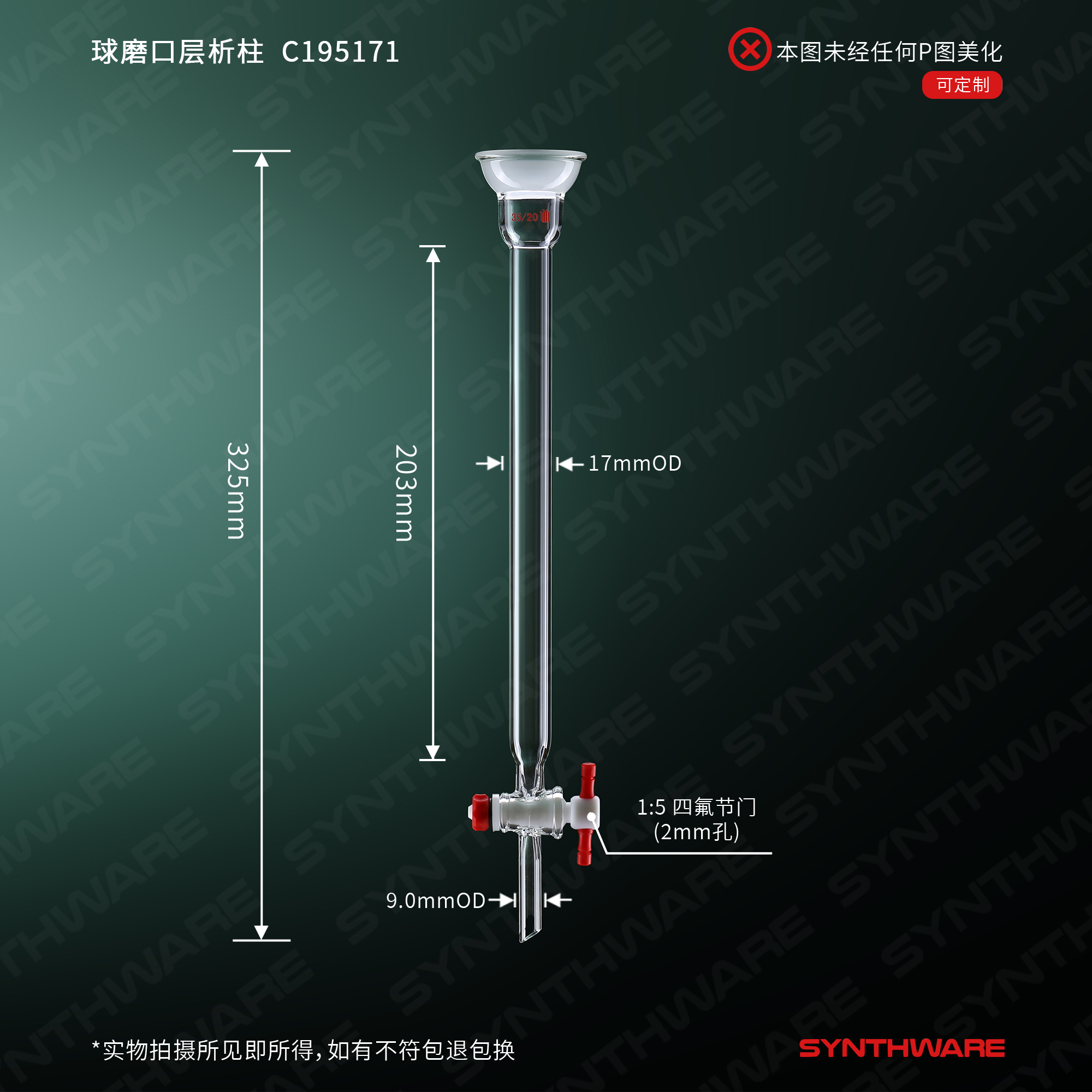 层析类 > 层析柱 > 球碗口闪式-无砂版层析柱 > SYNTHWARE > 球磨口层析柱,φ17mm,有效长:203mm,2mm节门孔径,35/20 C195171