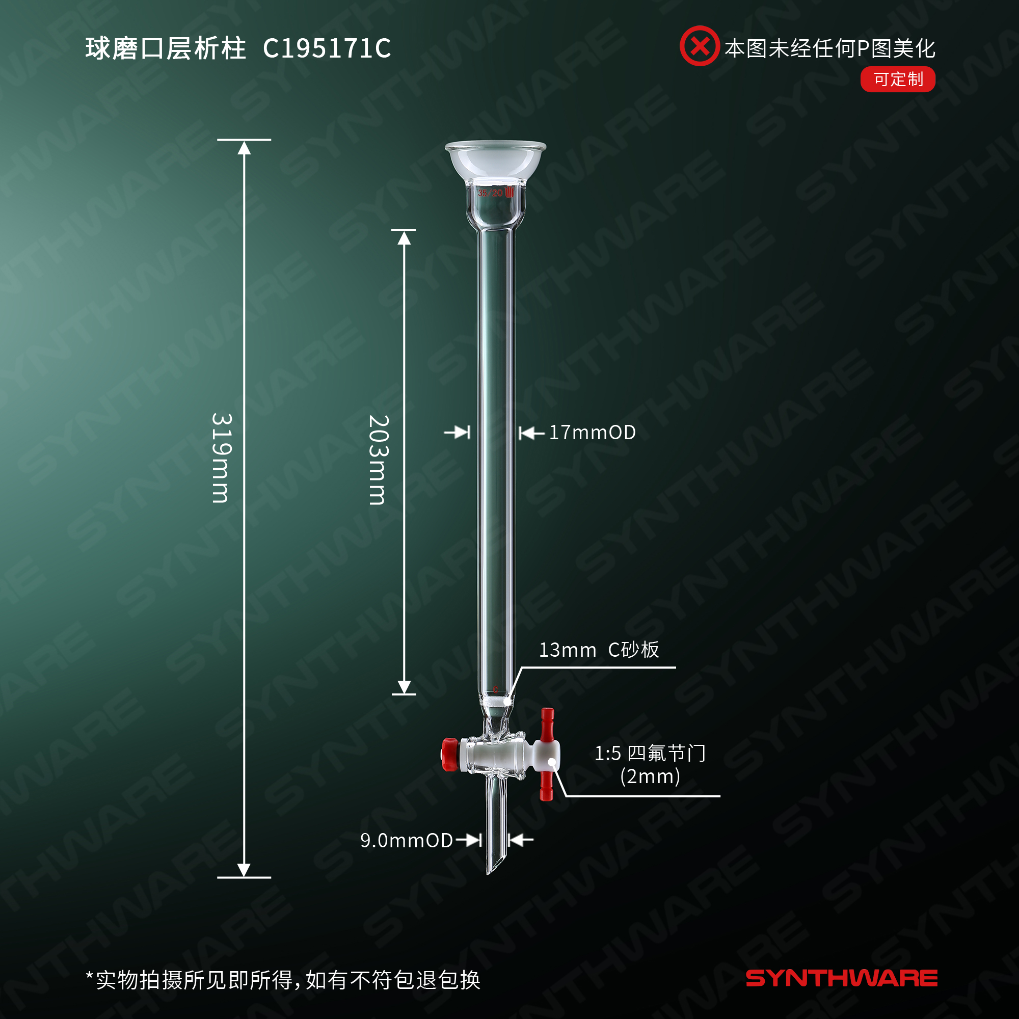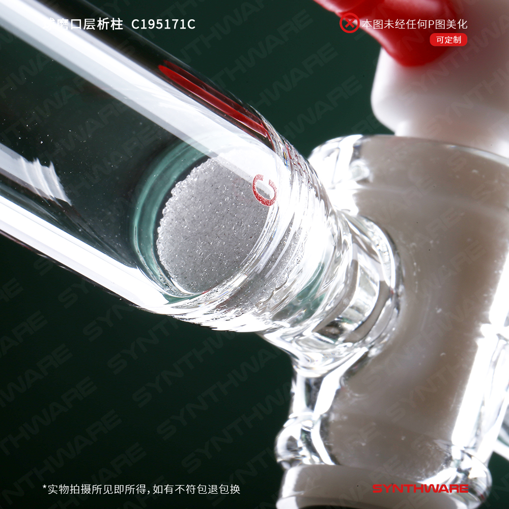 层析类 > 层析柱 > 球碗口具砂板闪式层析柱 > SYNTHWARE > 具砂板球磨口层析柱,φ17mm,有效长:203mm,2mm节门孔径,35/20 C195171C
