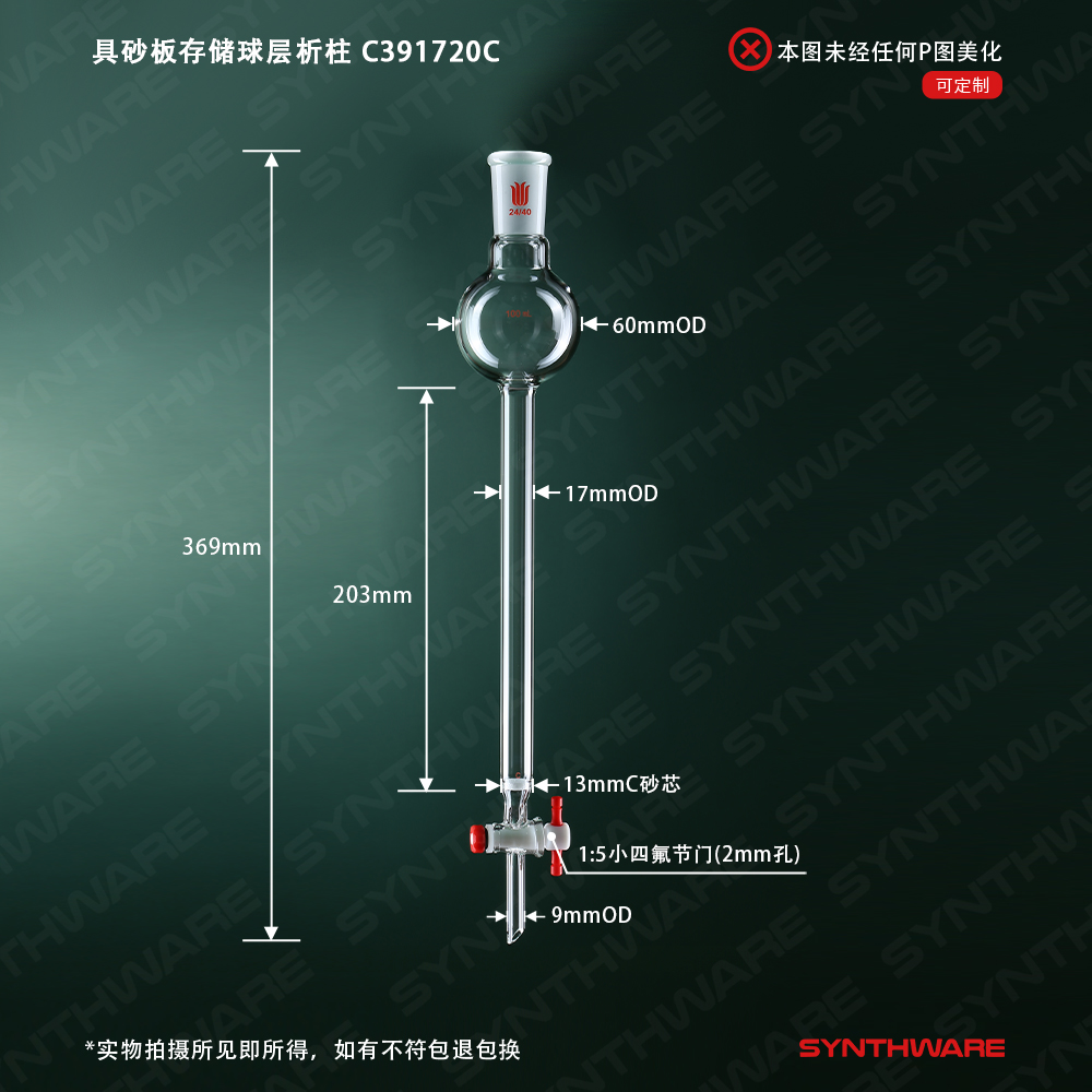 层析类 > 具存储球层析柱 > 具砂板存储球闪式层析柱 > SYNTHWARE > 具砂板存储球层析柱,24/40,φ17mm,有效长203mm,存储球容量100ml C391720C