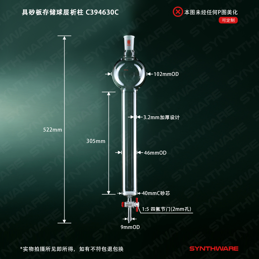 层析类 > 具存储球层析柱 > 具砂板存储球闪式层析柱 > SYNTHWARE > 具砂板存储球层析柱,24/40,φ46mm,有效长305mm,存储球容量500ml C394630C