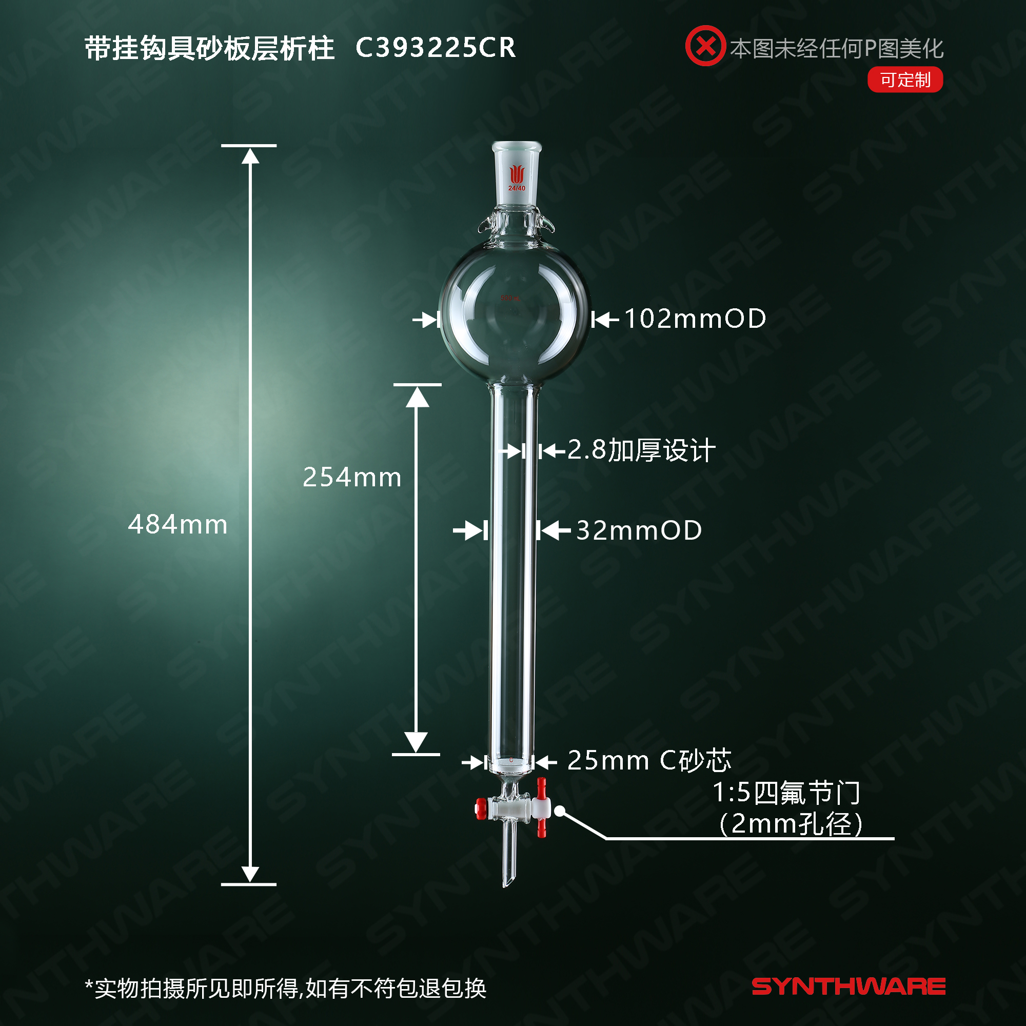 层析类 > 具存储球层析柱 > 带挂钩-具砂板存储球闪式层析柱 > SYNTHWARE > 带挂钩具砂板层析柱,24/40,φ32mm,有效长254mm,存储球容量500ml C393225CR