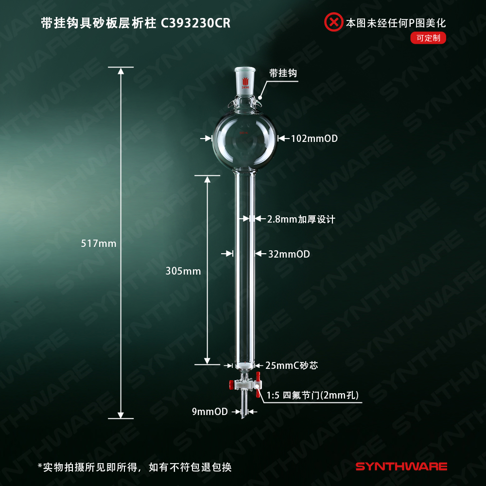 层析类 > 具存储球层析柱 > 带挂钩-具砂板存储球闪式层析柱 > SYNTHWARE > 带挂钩具砂板层析柱,24/40,φ32mm,有效长305mm,存储球容量500ml C393230CR