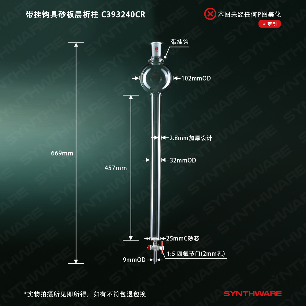 层析类 > 具存储球层析柱 > 带挂钩-具砂板存储球闪式层析柱 > SYNTHWARE > 带挂钩具砂板层析柱,24/40,φ32mm,有效长457mm,存储球容量500ml C393240CR