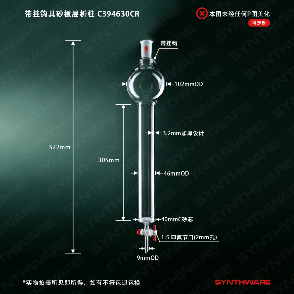 层析类 > 具存储球层析柱 > 带挂钩-具砂板存储球闪式层析柱 > SYNTHWARE > 带挂钩具砂板层析柱,24/40,φ46mm,有效长305mm,存储球容量500ml C394630CR